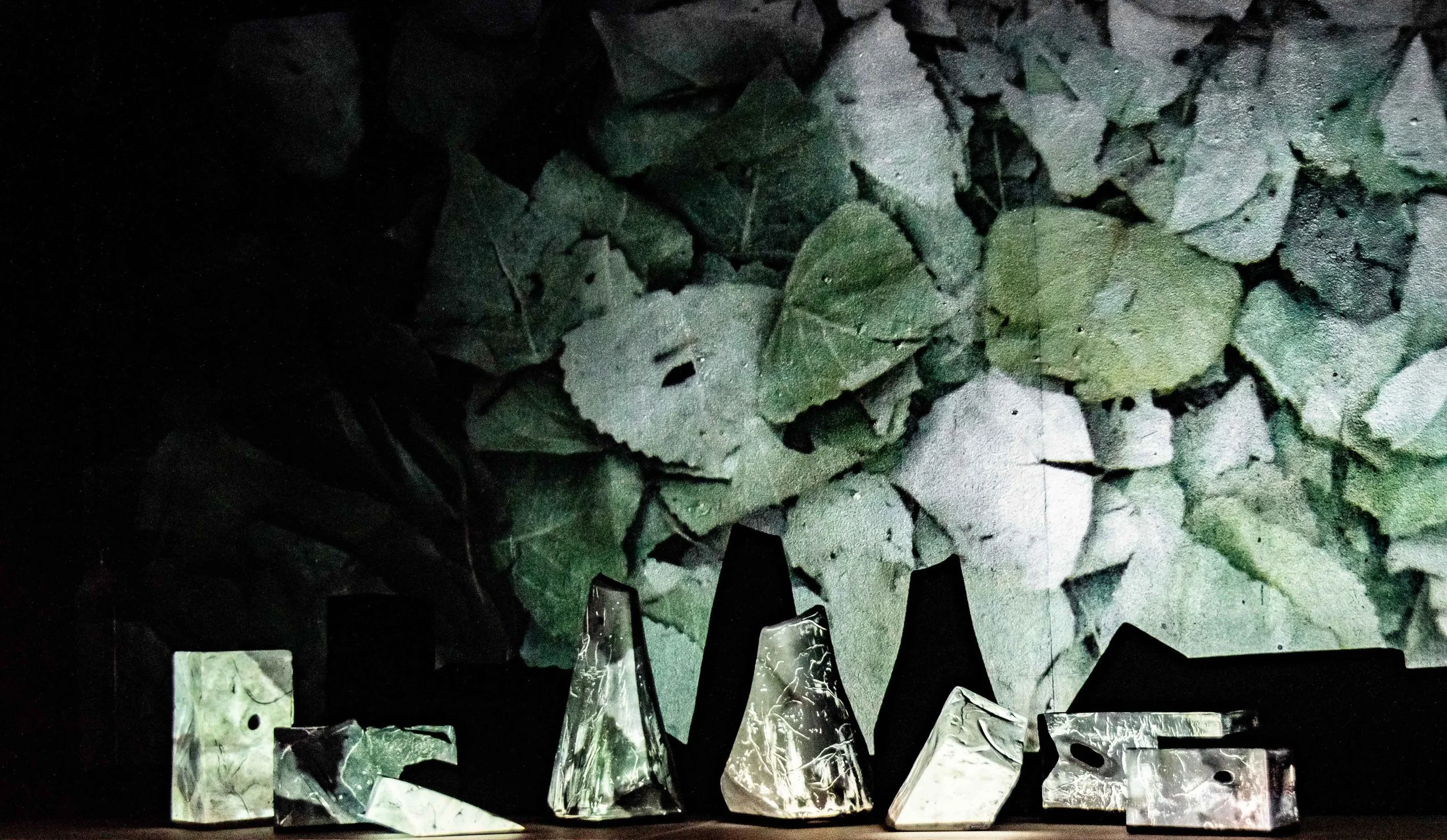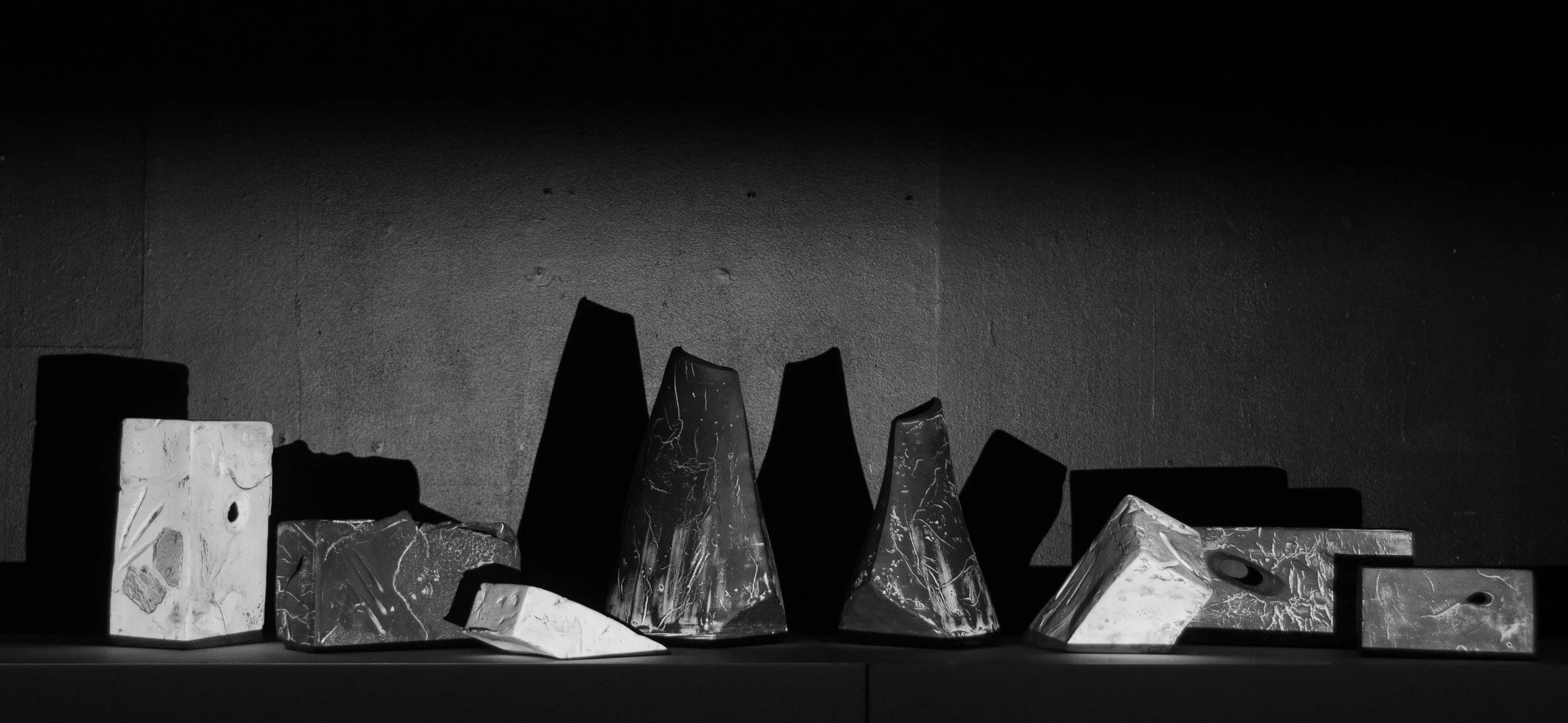 'Intent' combines two types of sculptural forms: Foundation Stones, remnants of long-abandoned built architectural structures, the building blocks of human ingenuity, a once civilised society that is now of no matter, and Mountain forms, representing deep time. Each form carries memories of time passed, with imprints of biological life on Earth’s geological surface, marks of meteors travelling through galaxies demonstrating universal, deep geological time, and the ruptures and distress of enduring the eons on their surfaces.